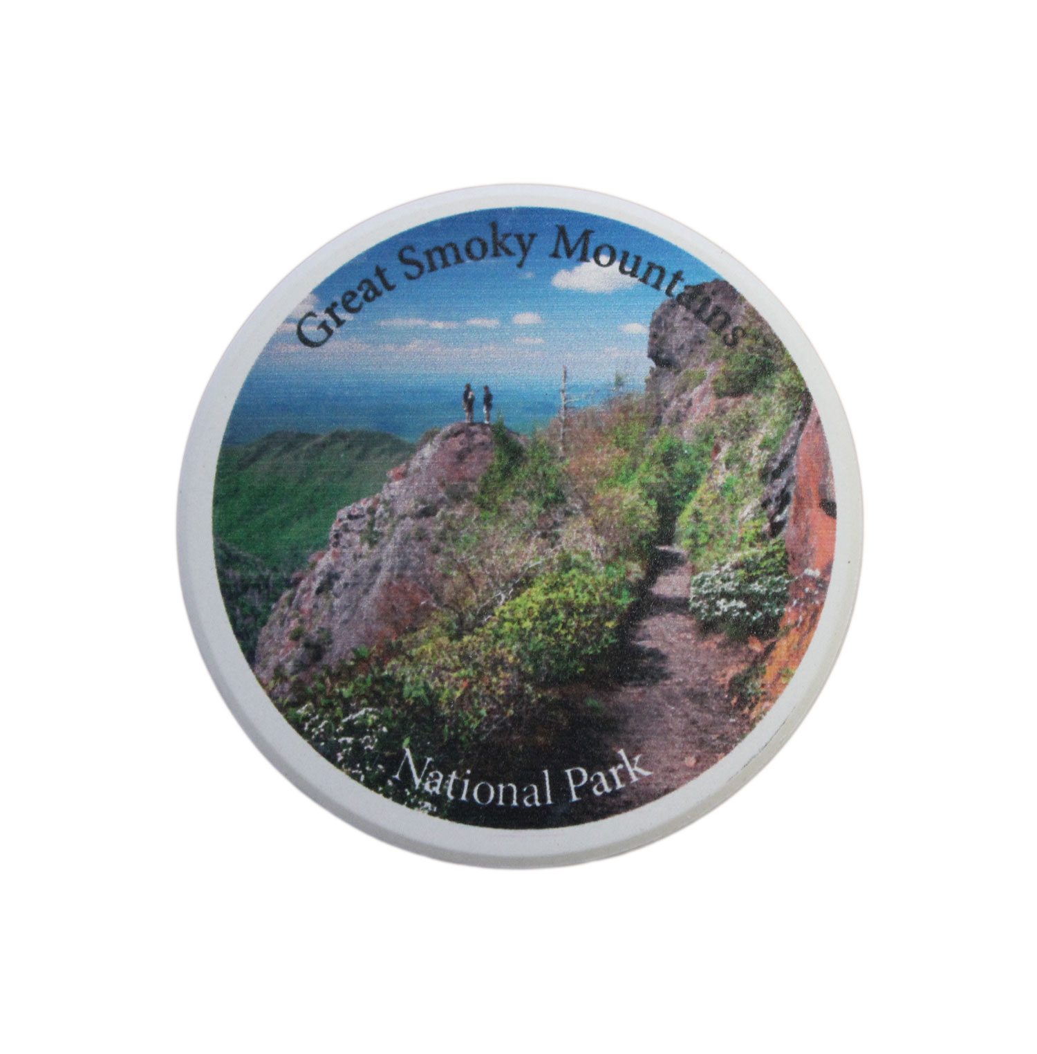Protect your car from unwanted spills with absorbent car coasters featuring a picturesque stone outcrop known as Charlies Bunion – a favorite site from Great Smoky Mountains National Park. The coasters are made from special absorbent ceramic stone that easily absorbs water outside the cup.