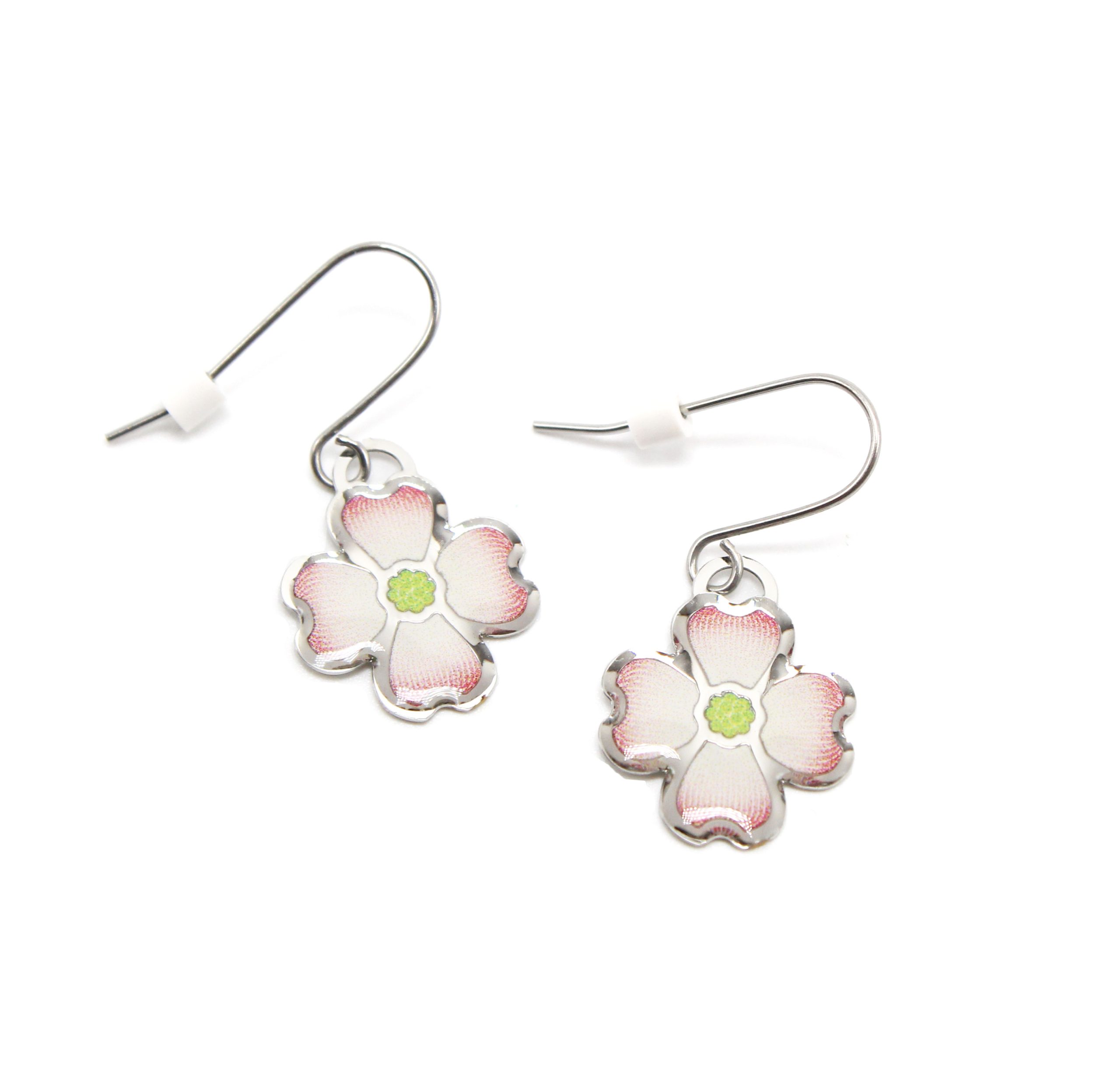 Blooming in early spring, the blossoms of the dogwood appear like a cloud of great snowflakes falling through the interlaced branches. The design for this Great Smoky Mountains dogwood blossom earring was inspired by the Mary Vaux Walcott’s North American Wild Flowers, published by The Smithsonian Institution in 1925. Earrings measure 1.25 inches made from brass, electro-plated silver and hypoallergenic ear wires.