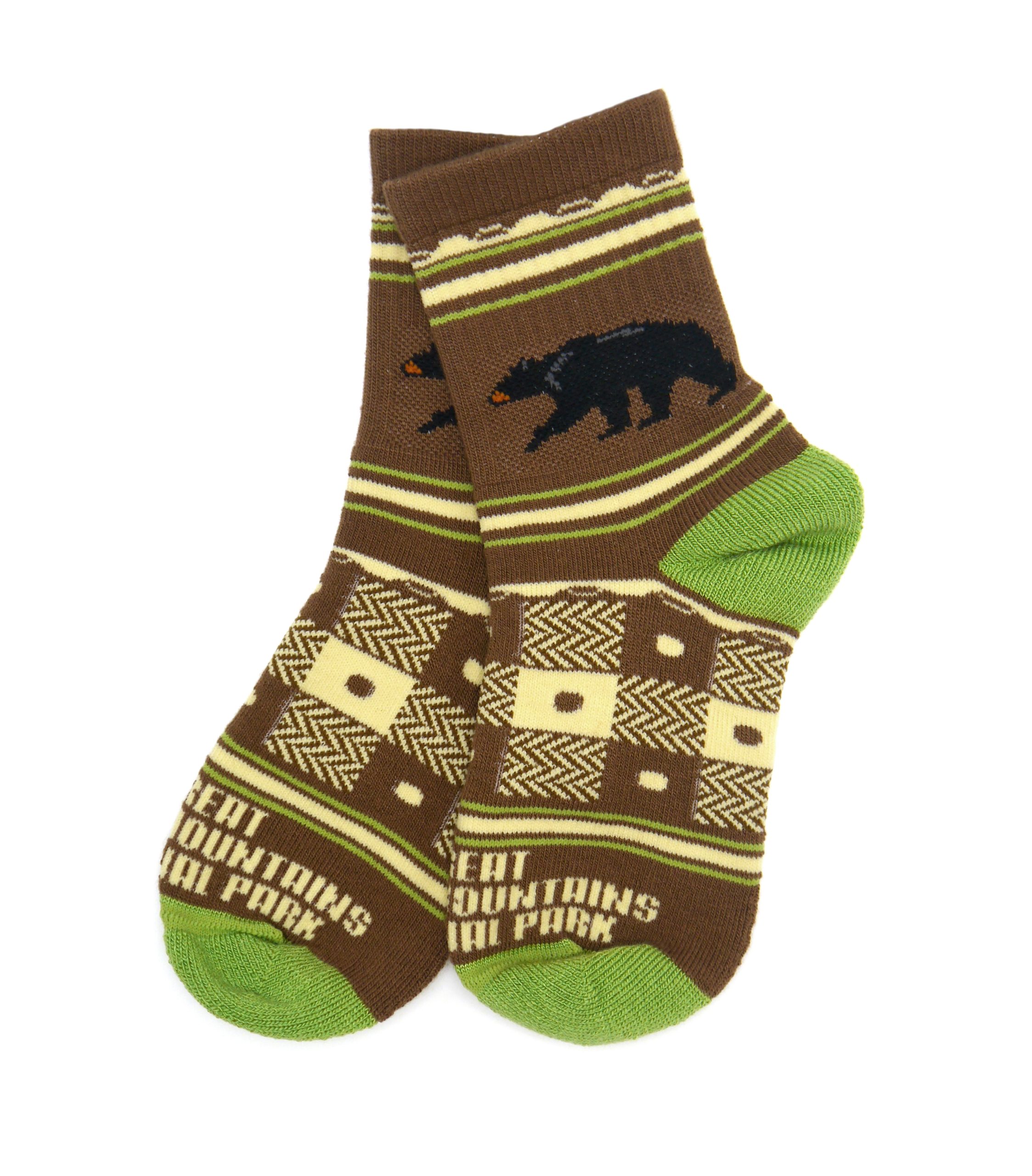 Keep your feet warm in our Great Smoky Mountains National Park black bear socks. Made from an 83% acrylic, 14% polyester, 2% spandex and 1% rubber. Adult size socks for women sizes: 6-11 and for men sizes: 5-10.