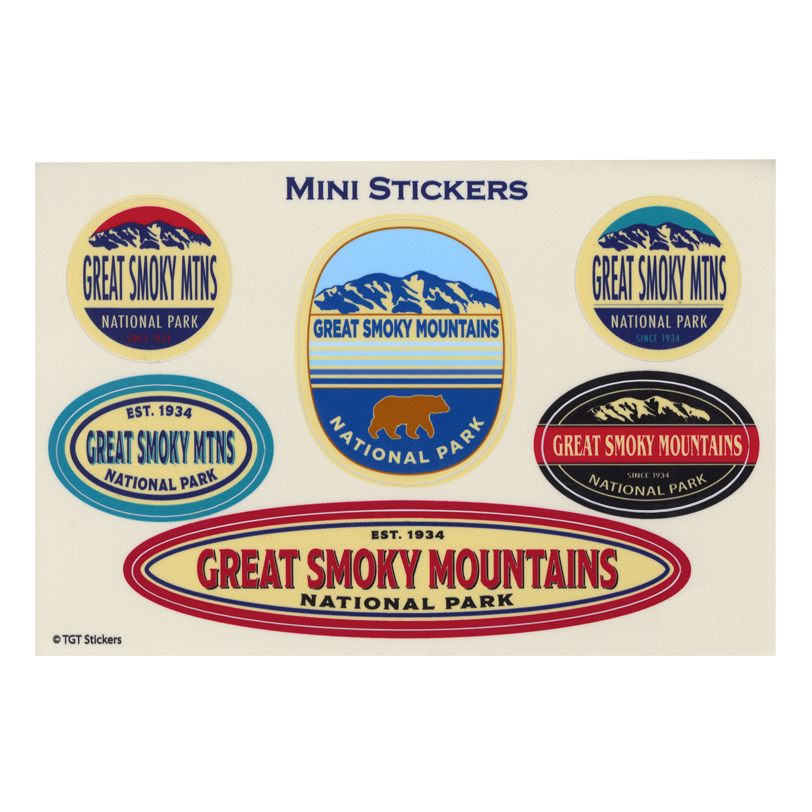 This set of 6 mini souvenir stickers from Great Smoky Mountains National Park would work well in a vacation scrapbook, on a water bottle and just for fun! Small stickers are 1.25 inches in diameter, largest is 4.5 x 1 inches.
