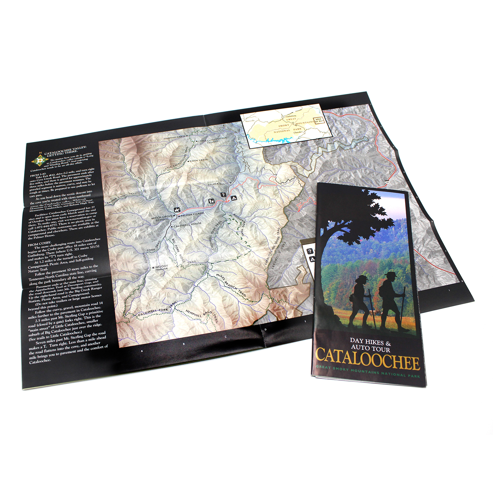 This handy map/guide includes a large-scale topographic map of all the trails and roads in the Cataloochee Valley area as well as trail profiles and descriptions of the most popular day hikes. There are also historical photos of pre-park life in the valley and a short history of Little and Big Cataloochee, plus elk facts and tips on elk viewing. Published by Smokies Life.
