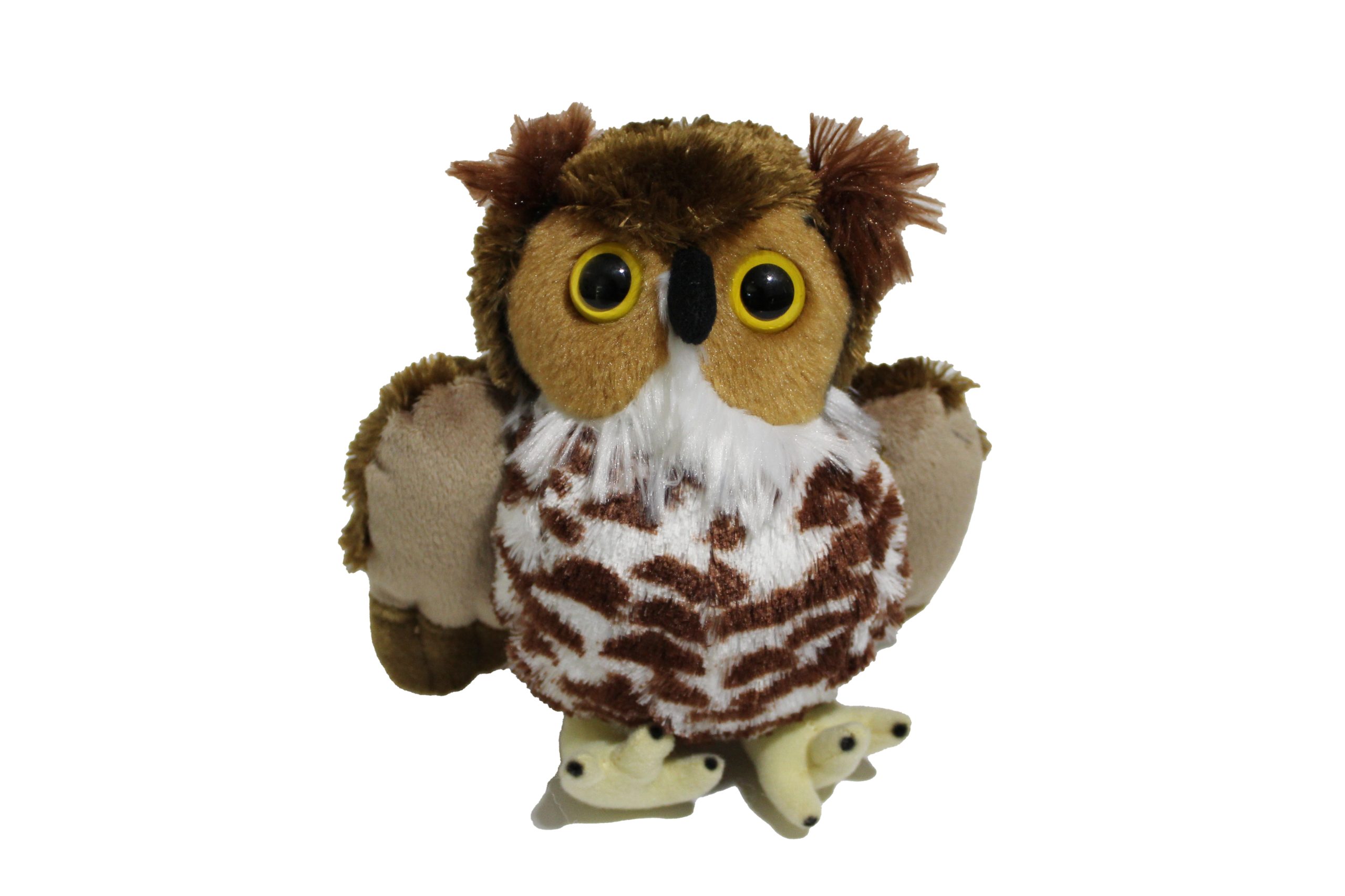 The great horned owl is named for the tufts of feathers that sit atop its head. This fuzzy little owl plush toy is about 6 inches tall and is filled with material made from recycled water bottles.
