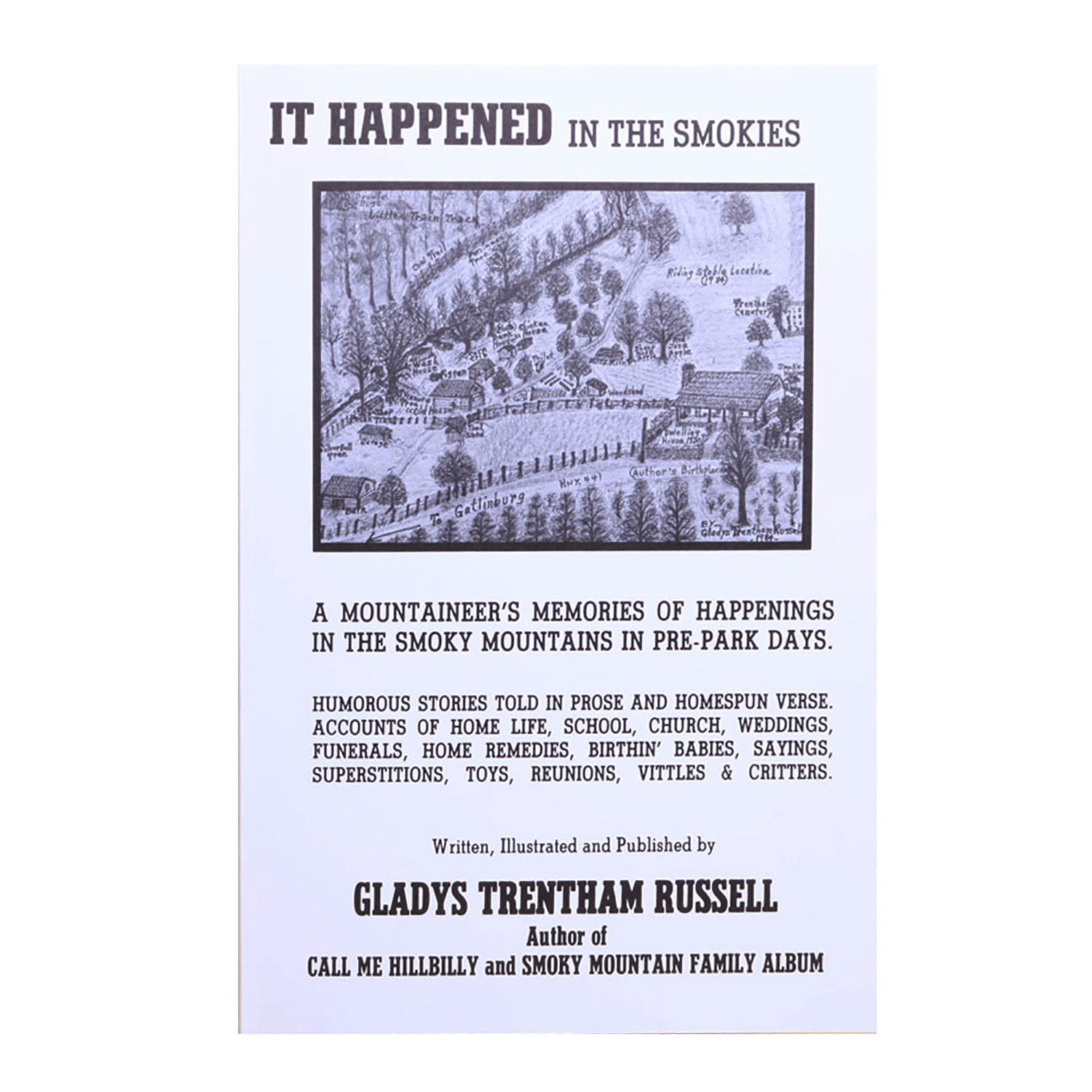 A mountaineer’s memories of happenings in the Smoky Mountains in pre-park days. Humorous stories told in prose and homespun verse by Gladys Trentham Russell. Accounts of home life, school, church, weddings, funerals, home remedies, birthin’ babies, sayings, superstitions, toys, reunions, vittles and critters. Hand-drawn black and white illustrations of antique curiosities and maps. Softcover, 135 pages.