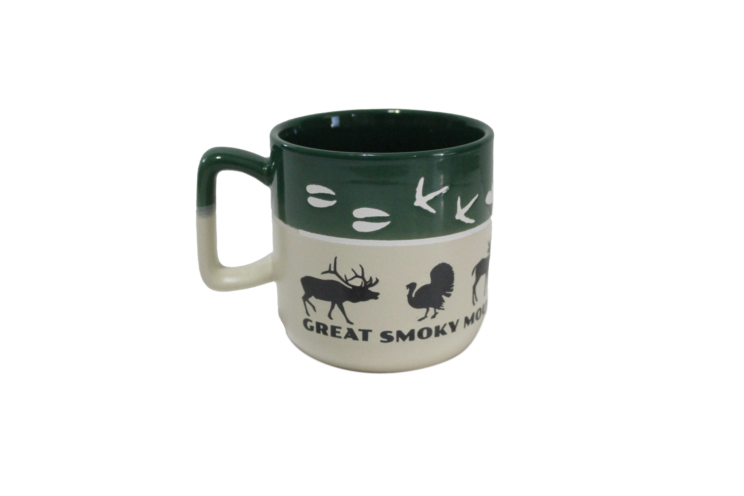 This ceramic mug features Great Smoky Mountains wildlife: elk, wild turkey, red fox, black bear, and salamander along with their individual tracks. Mug is dishwasher and microwave safe.