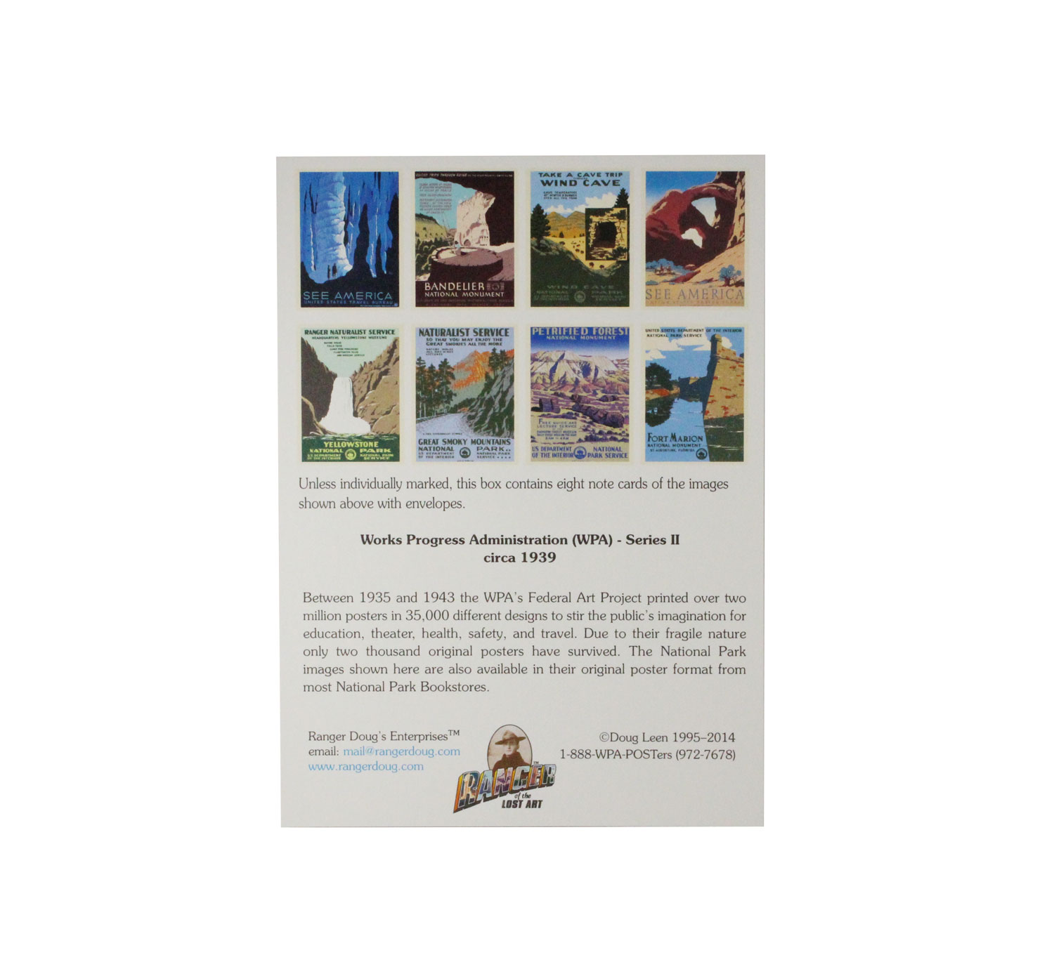 This box contains eight note cards of retro artwork inspired by the artwork of the Works Progress Administration in the 1930s featuring Chimney Tops from the Newfound Gap Road with overgrown trees. Note cards measure 4.5 x 6.25 inches.
