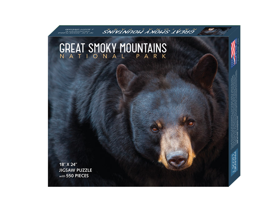 Great Smoky Mountains National Park is one of the few remaining places in the eastern United States where black bears live in wild, natural surroundings. Approximately 1,500 bears live in the Smokies and inhabit all elevations of the park. Black bears are excellent tree climbers but are also capable swimmers and can run up to 30 miles-per-hour. One of these beautiful creatures has been magnificently photographed by J. Scott Graham and is available on a 550-piece jigsaw puzzle that measures 18” x 24” when assembled. This puzzle is suitable for all ages and proudly made in the USA.