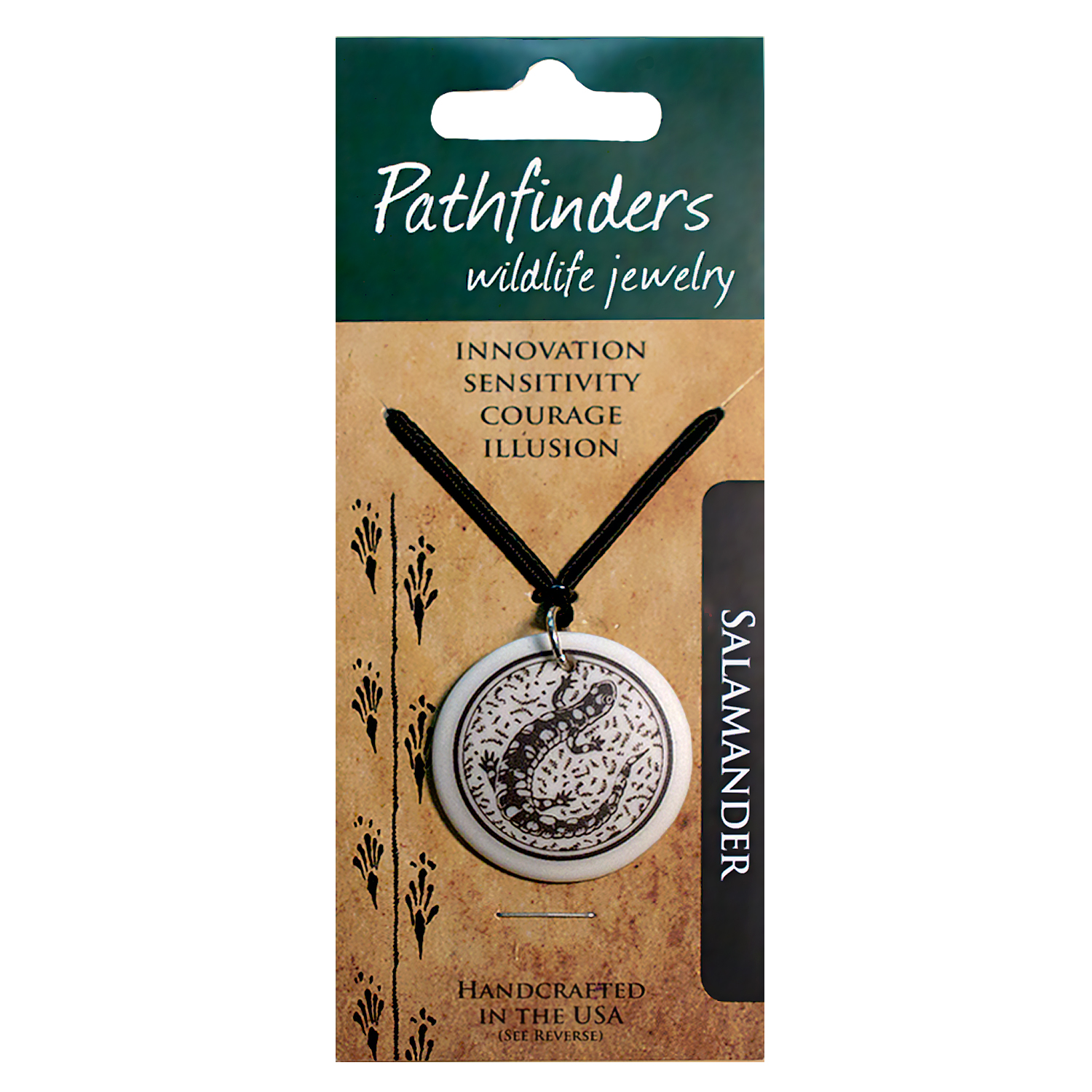 This durable porcelain pendant featuring a salamander is waterproof, kiln-fired at 2200 degrees F, and the design will not fade or wear off. It comes with a 32-inch durable braided cord. Each piece is made by hand in DeWitt, Michigan, so you are assured of supporting made in the USA products with this purchase.