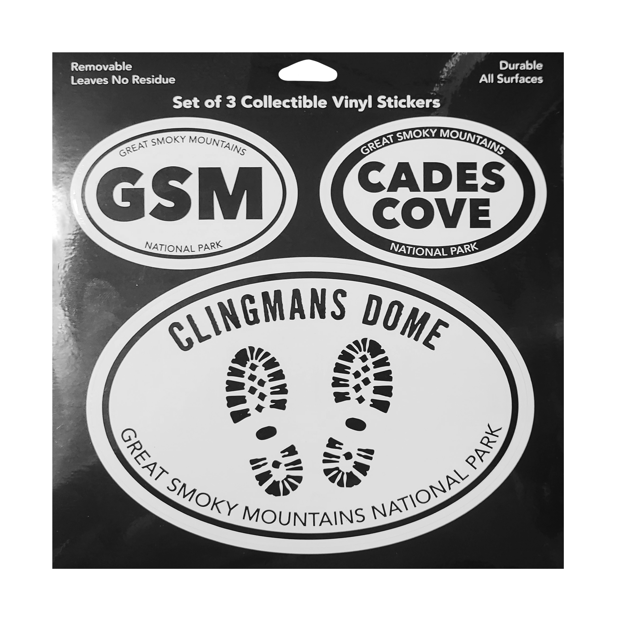 This set of 3 collectible souvenir stickers features Cades Cove, Clingmans Dome, and Great Smoky Mountains National Park. Great for all surfaces. Smaller stickers measure approximately 2.5″ wide and 1.75″ tall. The larger sticker measures approximately 5 x 3.5 inches.