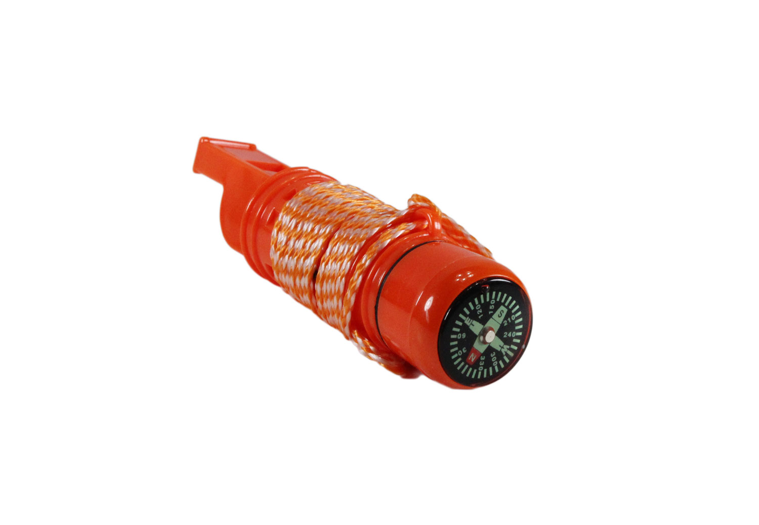 Feel safe and prepared on the trail with this 5-in-1 survival tool. Tool is 4 inches long and includes waterproof match box, liquid-filled compass with luminous dial, signal whistle, fire starter flint and signal mirror. Lanyard included.