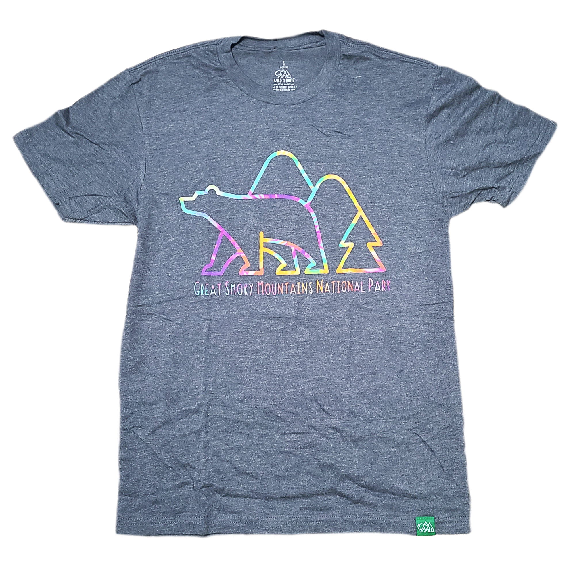 With a subtle variation on tie-dye, this Great Smoky Mountains National Park t-shirt has a tie-dye graphic on a solid purple color background. Featuring a stylized mountain skyline with black bear and pine tree, this stylish shirt makes a great souvenir! Made from 50% polyester, 25% cotton and 25% Rayon.