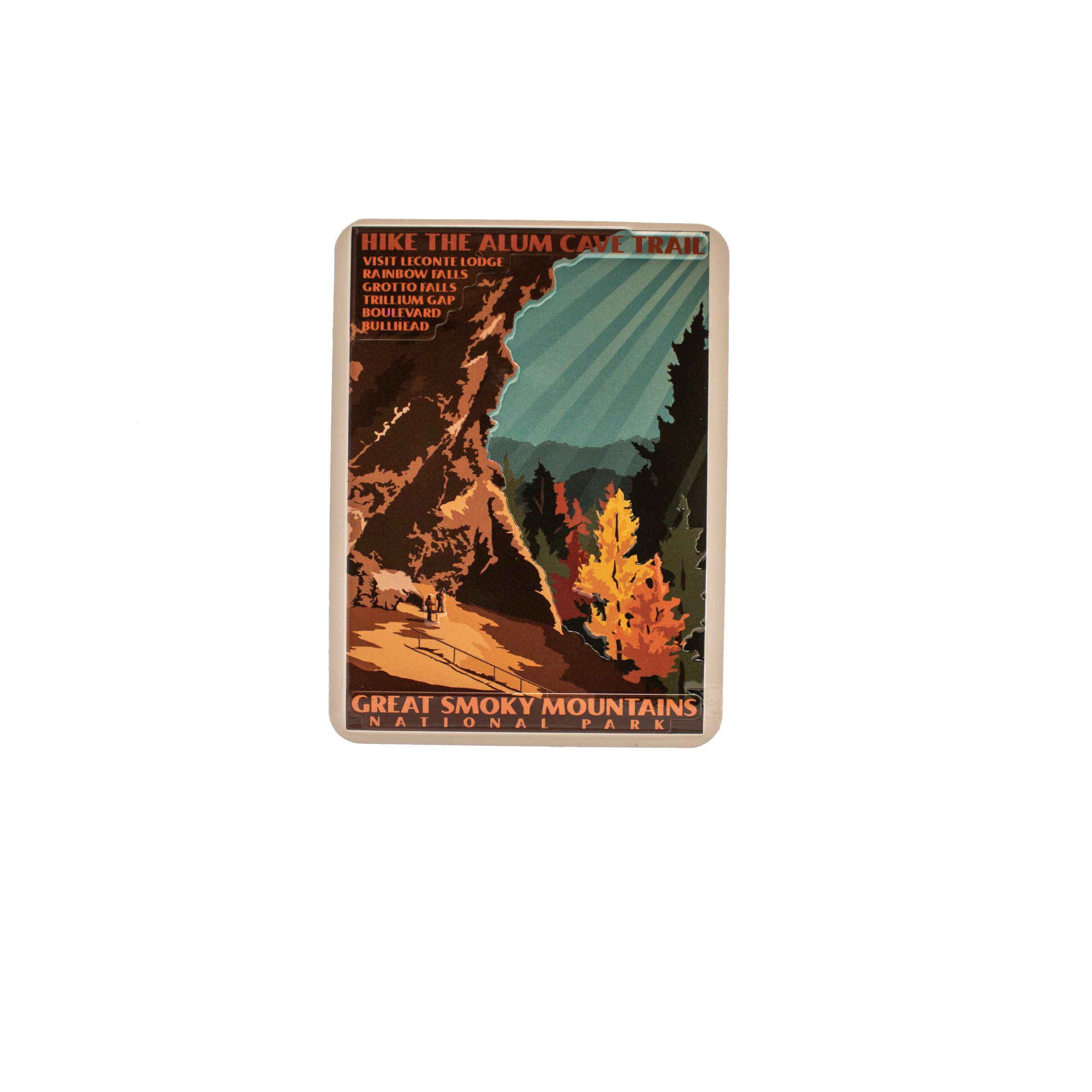 This Great Smoky Mountains National Park Alum Cave magnet artwork is rendered in retro style. Magnet measures 2.5 x 3.25 inches.