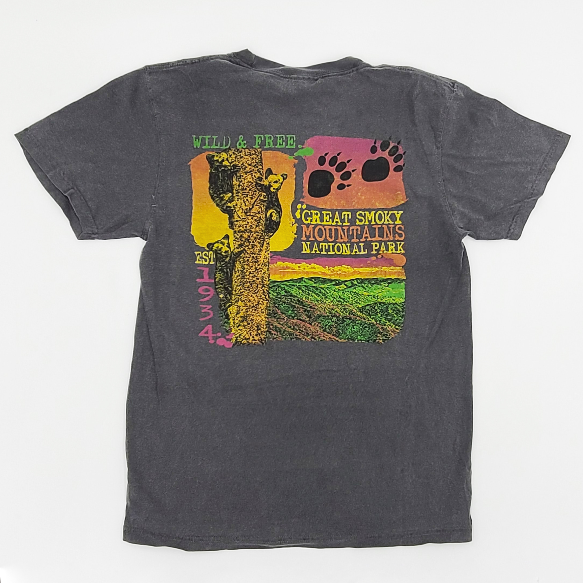 Feel the wild & free spirit of the mountains with this Great Smoky Mountains National Park t-shirt featuring colorful artwork on the back. Made from 100% cotton.